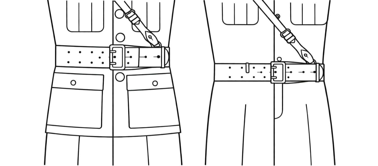 Shoulder Strap measurement is taken from the point where your belt will sit under the left pocket. Run the soft tape measure over the right shoulder and to a similar point on the back and take note of measurement. This step must be repeated for Polly and Service dress as the strap length will vary due to the Waist Belt being worn at different heights. Service jacket shoulder measurement will be shorter.